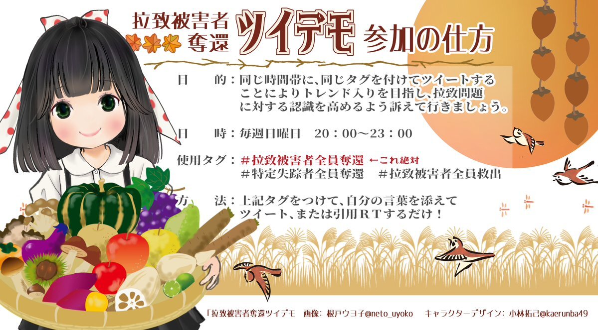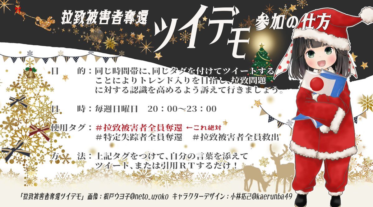 毎週日曜日の夜はらち被害者だっかんツイデモ ! どなたでも参加できます 初参加の人も大かんげい ↓のタグをつけて一言そえてツイートするだけ ! 多くの人に「らち問題」に関心を持ってもらえるように、たくさんの方の参加お待ちしてます ! #拉致被害者全員奪還 #特定失踪者全員奪還