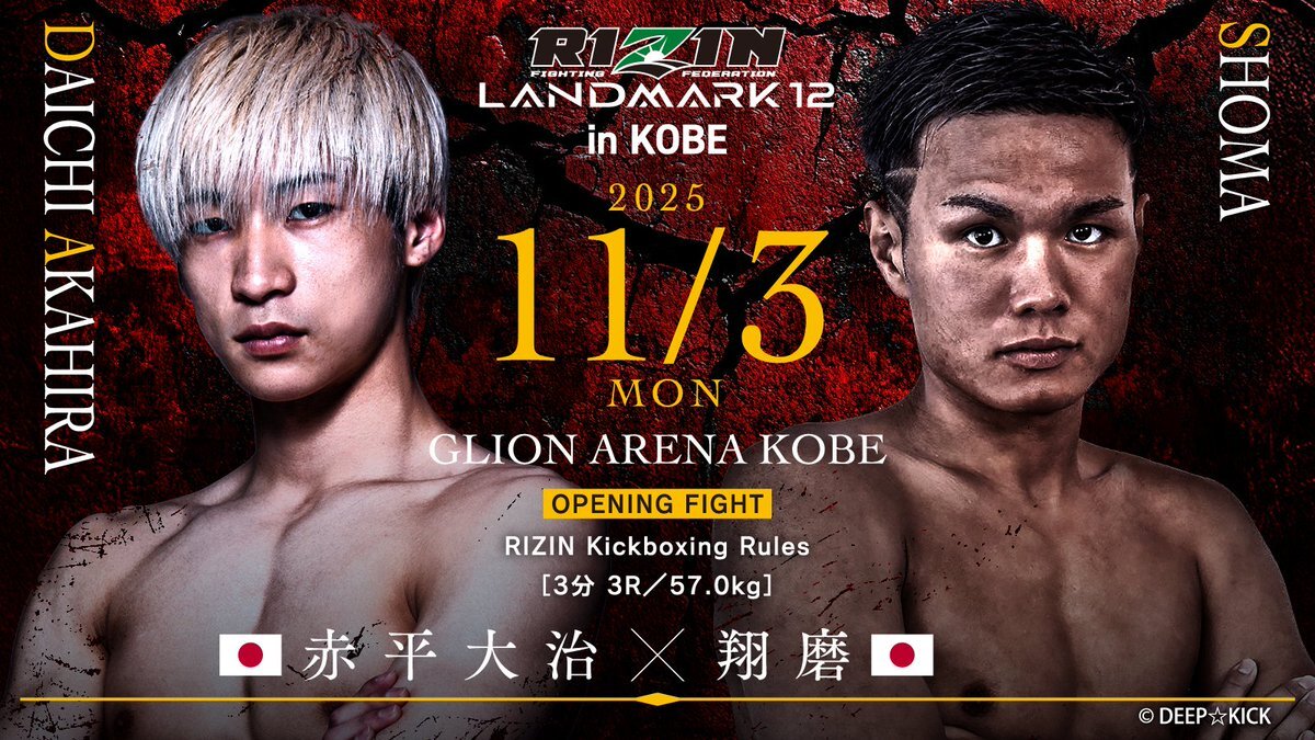 #RIZIN_LANDMARK12 in KOBE⚓️ 🎊インスタライブでカード発表🎊 OPENING FIGHT RIZIN キックボクシングルール:3分 3R 57.0kg 🟥#赤平大治/@AkahiraDaichi🇯🇵 ーーー🆚ーーー 🟦#翔磨/@L9new_xq🇯🇵 DEEP☆KICK5王者/HOOST CUP王者 📅11/3(月・祝)11:00開場/13:00開始(予定) 🏟GLION ARENA KOBE x.com/rizin_PR/statu…