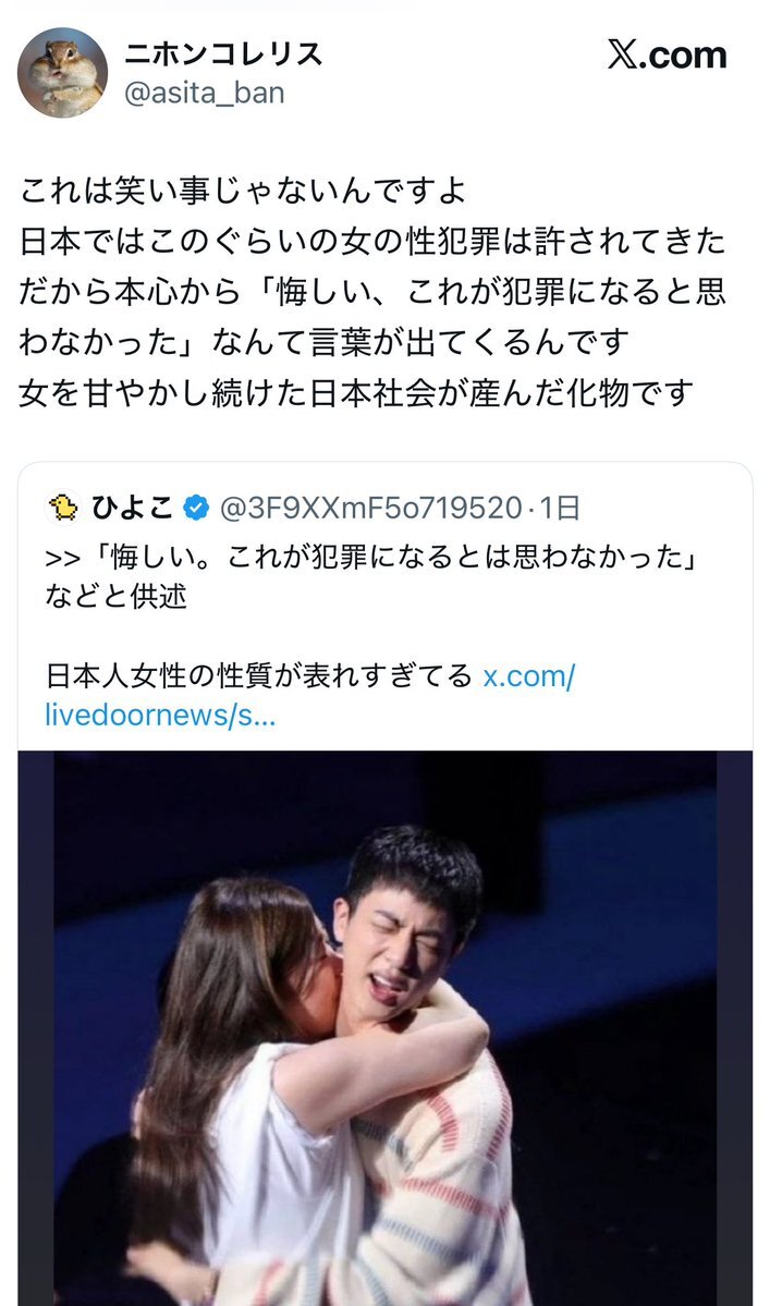 すごい叩かれてるけど、日本は極めて女性による乱暴狼藉に甘いので「これが犯罪になるとは思わなかった」というのはただの事実というかそう思ってて当たり前だし、50年も日本で女性やっててどっぷり甘やかされた人間に今更「反省しろ」というのも酷だろ。つまりこれは日本の男が悪い。 x.com/livedoornews/s…