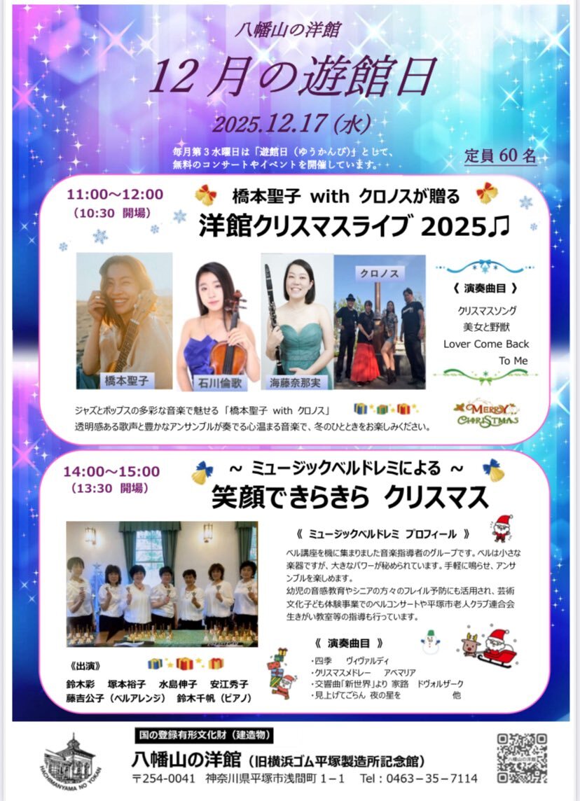youtu.be/shrnQ7llNik?si… 12/17 クリスマスライブ 平塚市教育委員会主催です 🔔✨お知らせ✨🔔 今年の冬もやってきます🎅💫 橋本聖子 with クロノスが贈る 八幡山の洋館クリスマスライブ2025🎄🤍 📅12月17日(水) ⏰10:30開場/11:00〜12:00演奏 🏠八幡山の洋館 🎟️入場無料(定員60名) pic.x.com/Hm6sEhr60v
