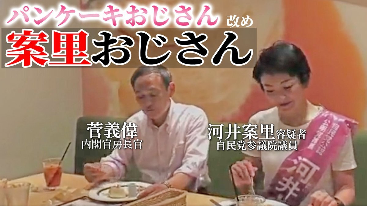 次の総理を目指す菅長官に「パンケーキおじさん」という意味不明の愛称が作り出されたようですが、あまりに実態とかけ離れています。 むしろここで注目するべきは、パンケーキを隣で一緒に食べていた人物・河井案里容疑者。現金を地元でバラまき、買収容疑で逮捕された人物と随分親しいようですね。 pic.x.com/DborduqHQS