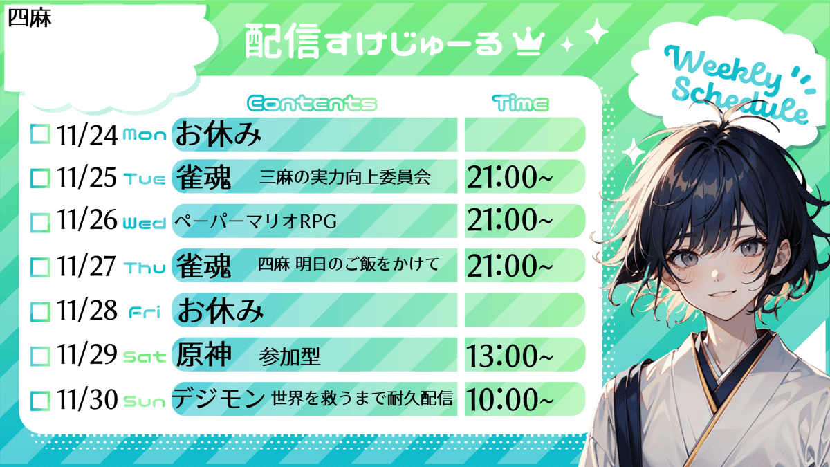 🌕今週の配信予定のお知らせ!🌕 今週の配信予定表を公開✨ 満月みちる、優雅に炭酸を片手に 麻雀に、ゲームの冒険に、 そして皆さまとの語らいへ――。 どうぞお好きな日をお選びになって、 お気軽に遊びにきてね。 今週も、ご一緒に楽しみましょうわ🍸✨ #配信予定 #新人Vtuber pic.x.com/RrhN1ra6Wx