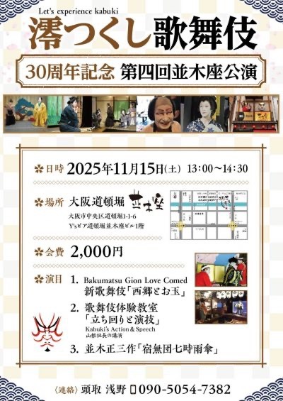 #イベント】11/15澪つくし歌舞伎30周年記念 第四回並木座公演 開演13:00~ #シミポタ 日時 2025年11月15日(土)13:00 ~ 14:30 場所 〒542-0077 大阪市中央区道頓堀1-1-6 Y'sピア道頓堀並木座ビル1階 道頓堀ミュージアム並木座 kyodo-portal.city.osaka.jp/event/24000033… pic.x.com/KwflhX4uSg