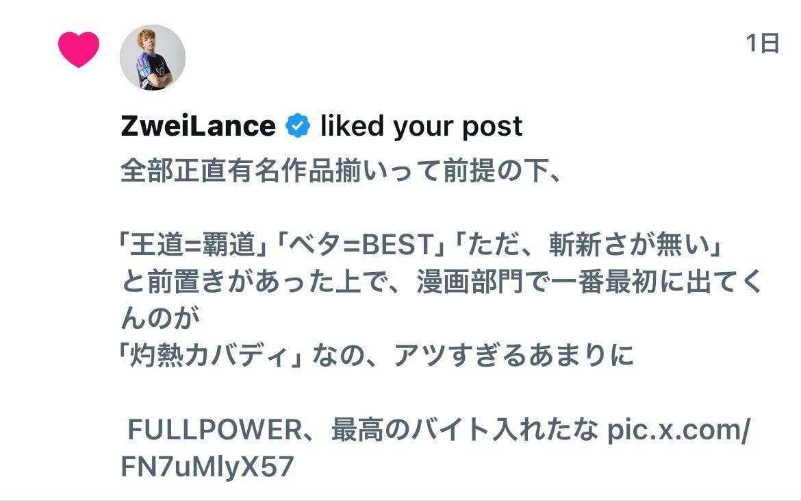 FULLPOWERでエゴサしてただけなんだろうけど、Zweiさんにいいねされると嬉しいなさすがに ZweiLanceとかいうDMP、ただひたすらに非常にアツい男だからな… 『灼熱カバディ』は、「熱」がありすぎる『ハイキュー!!』だからなマジで 全員読んだ方がいい ハイキュー!!は「青春」 灼熱カバディは「熱血」 pic.x.com/jt5EANR4av