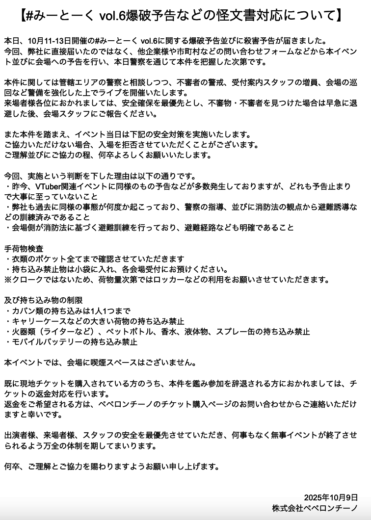 #みーとーく 爆破予告などの怪文書対応について】 pic.x.com/Nrv3WDZCiN