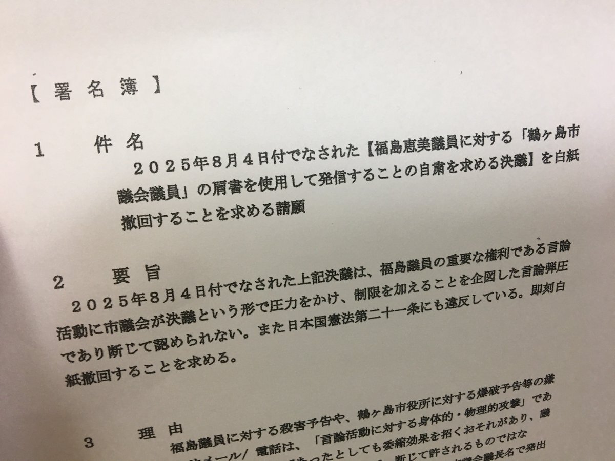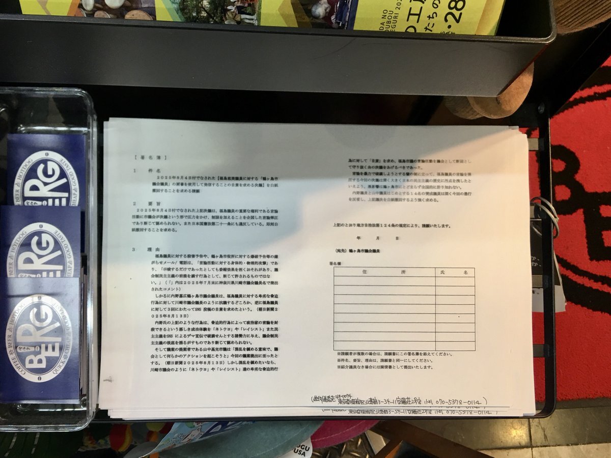 埼玉県鶴ヶ島市議会の8月4日の決議がとんでもなさ過ぎるので、白紙撤回を求める署名用紙をベルクにも起きました。福島めぐみ市議のXでの外国人差別反対のポストに対する嫌がらせのクレームが今年の5月頃から市に殺到し、殺害や爆破予告までありました。断じて許してはならないことなのに、市議会は何と pic.x.com/siioiVFxCI