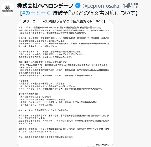 10月12日(日)のリアイベについてのお知らせです…! 爆破予告などが届いたみたいです。 当日は警備を強化して開催するみたいなのでもし不安な方は返金対応もしているみたいです😖 x.com/pepron_osaka/s…