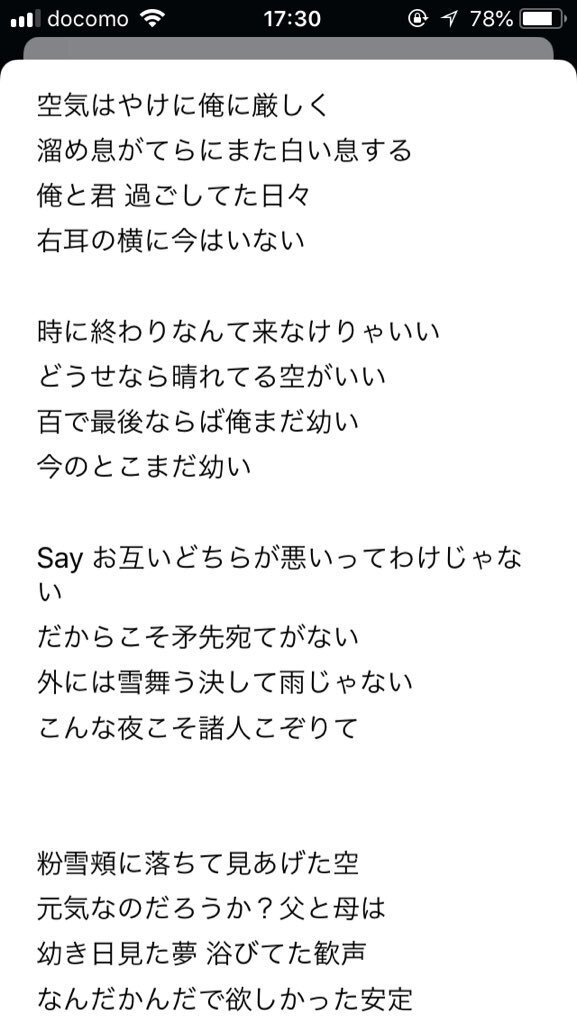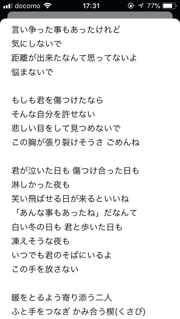 嵐オタ的に櫻井翔くんがプライベートで作ったクリスマスソングの歌詞が、牧春が別れていた時期の心象と重なって良い。 なんなら「二人の記念日」も良いし、恋愛ソングなら大体なんでも良いし、全部良い。 pic.x.com/noNzlUgC5X