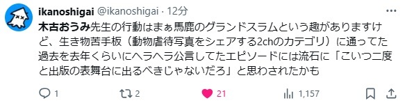 木古おうみ先生の行動はまぁ馬鹿のグランドスラムという趣がありますけど、生き物苦手板(動物虐待写真をシェアする2chのカテゴリ)に通ってた過去を去年くらいにヘラヘラ公言してたエピソードには流石に「こいつ二度と出版の表舞台に出るべきじゃないだろ」と思わされたかも