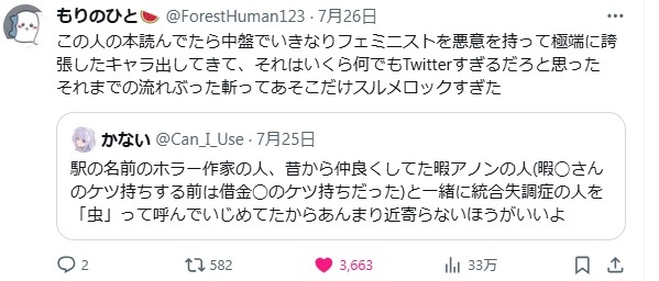 炎上中のカクヨムホラー作家木古おうみ、生き物苦手板の住人で虐待画像を投下してたって本当? 相互フォロワーの芦花公園も矢樹純先生から盗作したり、暇アノンに媚びて統合失調やアトピーの人を虫呼ばわりでいじめてたとか ホラー界隈の倫理観終わってるって言われても反論できない pic.x.com/4w7pia5oxb