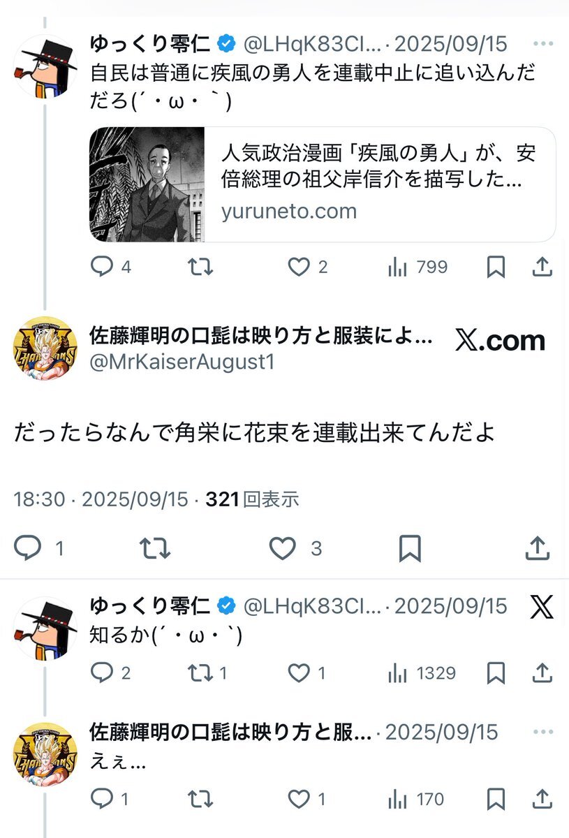 返信先:@Cannot_Kabaおいおいおいおい、引用元のカスは一体誰なんだと思ったら、前に岸信介が正しく妖怪チックに描かれていたから自民党が疾風の勇人を打ち切りにしたなどと言う妄言を吐いていたゴミクズじゃあないか! ならなんで角栄に花束をは打ち切られていないのかを聞いても知るかと言って逃げたゴミじゃあないか! pic.x.com/Pl23kvViHh