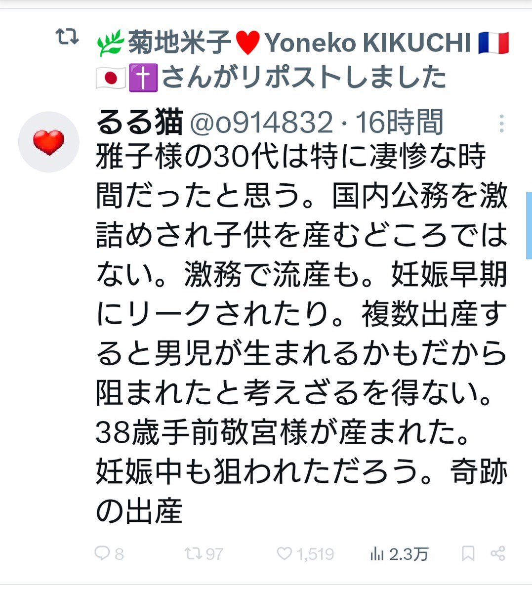 紀子さまは眞子さま妊娠中に猛吹雪の中で公務をなされていた。激務をこなし続け、3人も生み育ててこられたのは奇跡だ。 x.com/vmuud3xsl7chaj…