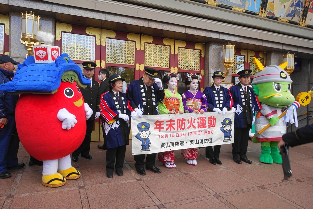 南座前で年末防火運動が行われ、祇園甲部の舞妓さん2名が参加し、道行く人にティッシュやメモ用紙を渡し、花見小路付近まで拍子木を打ちながら歩いて火災予防を呼びかけました。また東山消防署と南座のゆるキャラのとうりゅうくんとみなみーなも登場してくれました。南座にもゆるキャラいるんですね。 pic.x.com/MsiV3gHmyx