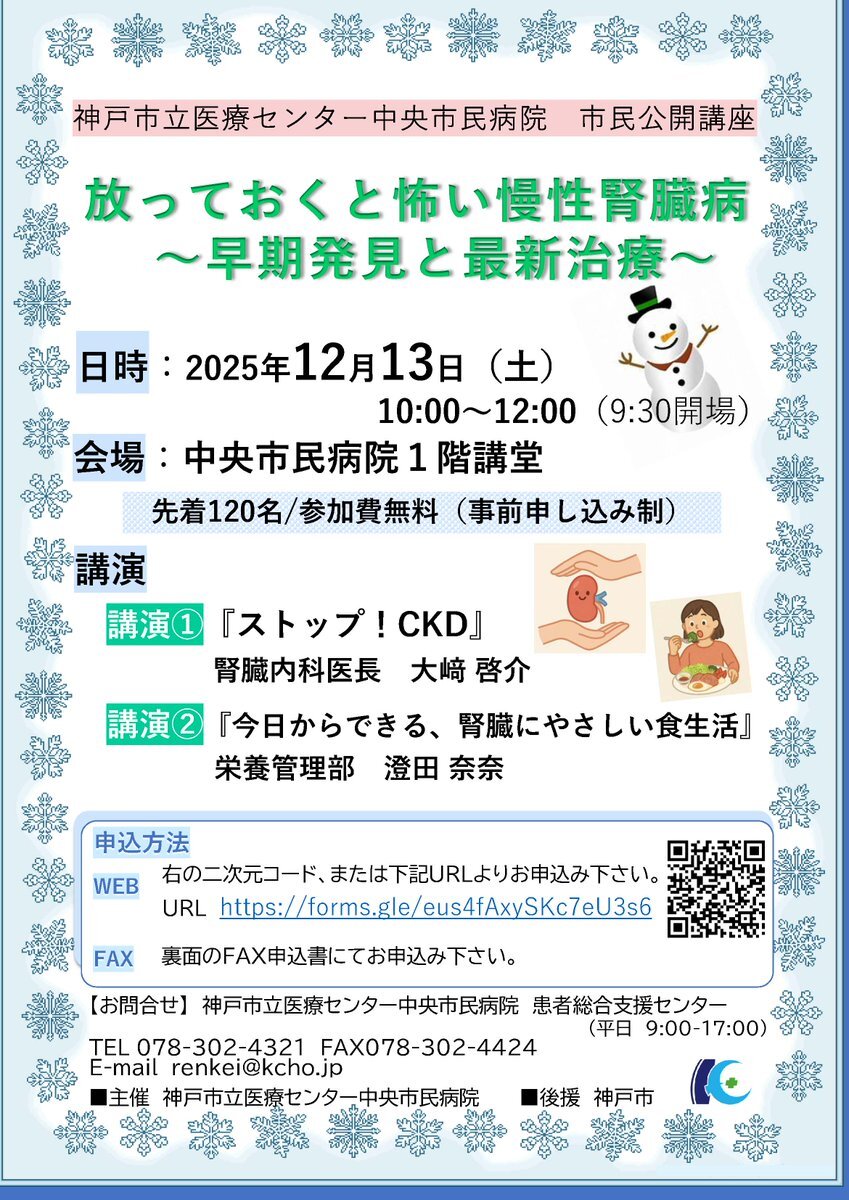 申込受付中(事前申込制)📢 #神戸市立医療センター中央市民病院 市民公開講座 📅12/13(土)10:00~12:00 📍中央市民病院 1階講堂 放っておくと怖い慢性腎臓病 ~早期発見と最新治療~ chuo.kcho.jp/news/305669/ pic.x.com/txrdus9sC7