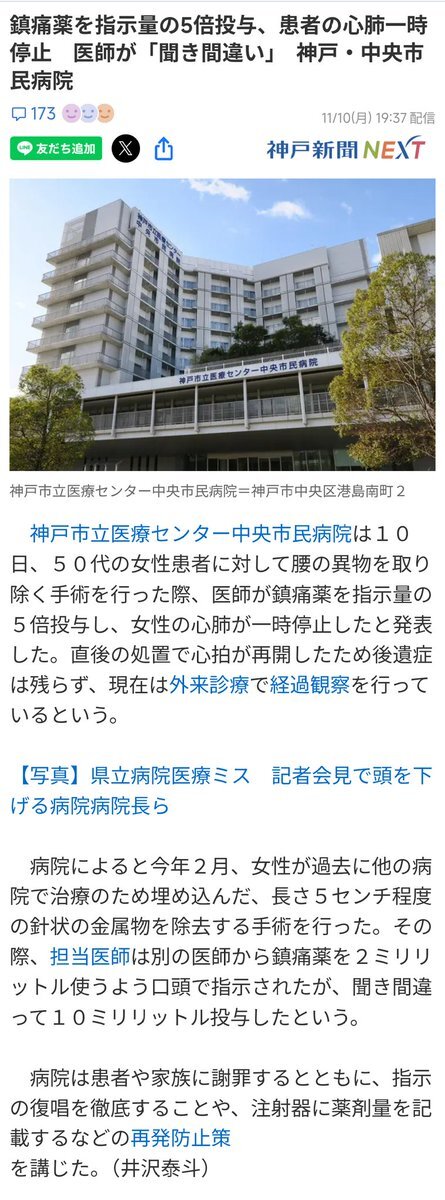 【ニュース】神戸市立医療センター中央市民病院で、手術中に医師が指示量の5倍の鎮痛薬を投与し、患者の心肺が一時停止する重大な医療ミスがありました。 ✅ポイント ・神戸市立医療センター中央市民病院で医療ミスが発生 ・50代女性患者への腰の手術中、医師が鎮痛薬を指示量の5倍投与
