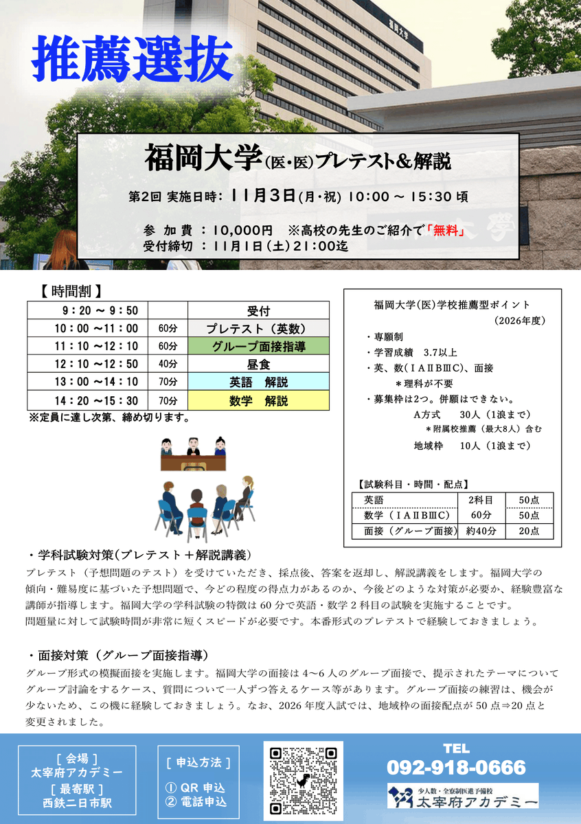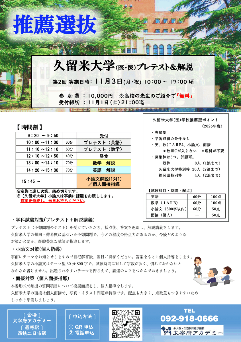 久留米大学|福岡大学医学部 推薦プレテスト&解説&面接対策 ◆プレ実施日:11/3(月・祝) ◆時間(久留米):10:00~  ※面接対策の都合で   終了が夕方になることも ◆時間(福大):10:00~15:30 ◆参加費:10,000円  ※高校の先生の紹介は「無料」 ◆会場:太宰府アカデミー本館 申込はリプ欄👇 pic.x.com/byxnnYPHrf