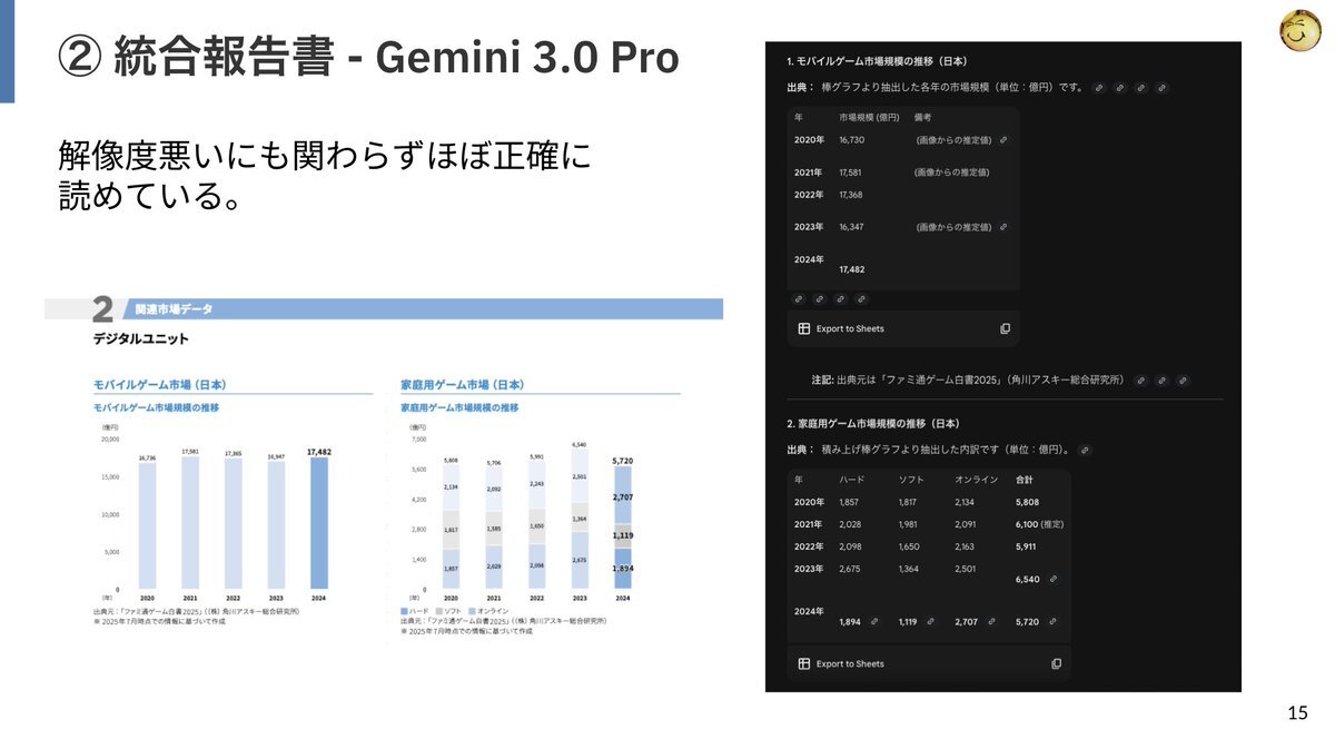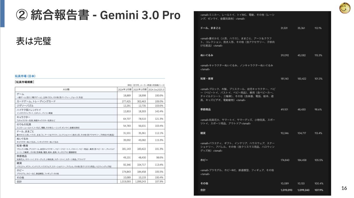 Gemini 3.0の日本語OCR性能を様々なモデルと雑に比較してたのだが、次元の違いを感じたな。 統合報告書的な複雑なカラム構成 + グラフ (円グラフ、積み上げ棒グラフ) + ネスト化された表が組み合わさった複雑なページでも正確にこなしてきた。 雑な比較じゃなくてちゃんとEvalやりたいな! pic.x.com/JYcZLb8EV9