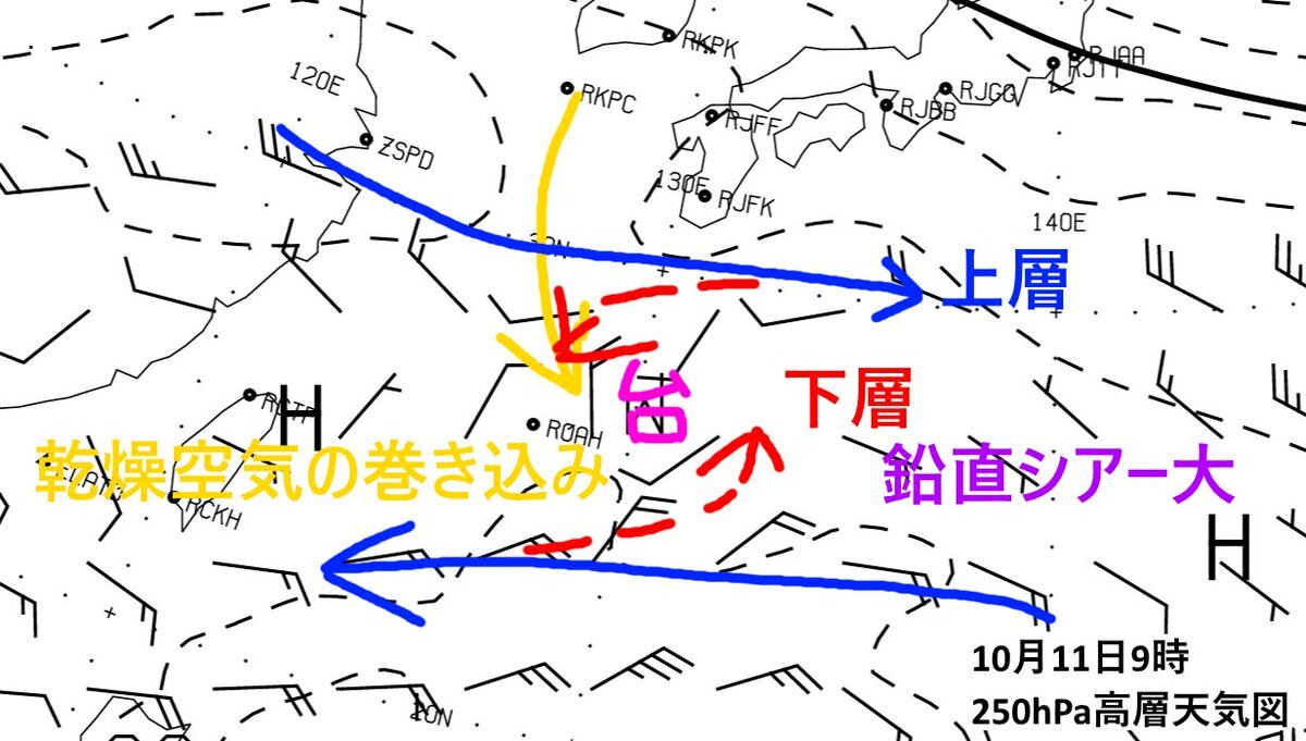 今朝の台風23号。緯度を上げつつ移動が遅くなる中で、乾燥した空気を巻き込んだせいか中心付近の構造がたいぶ崩れた。中心の渦周辺の雲は背が低くなり、活発な積乱雲の塊は中心から少し離れた南側。 続く #T2523 pic.x.com/HTOpPuEC8W