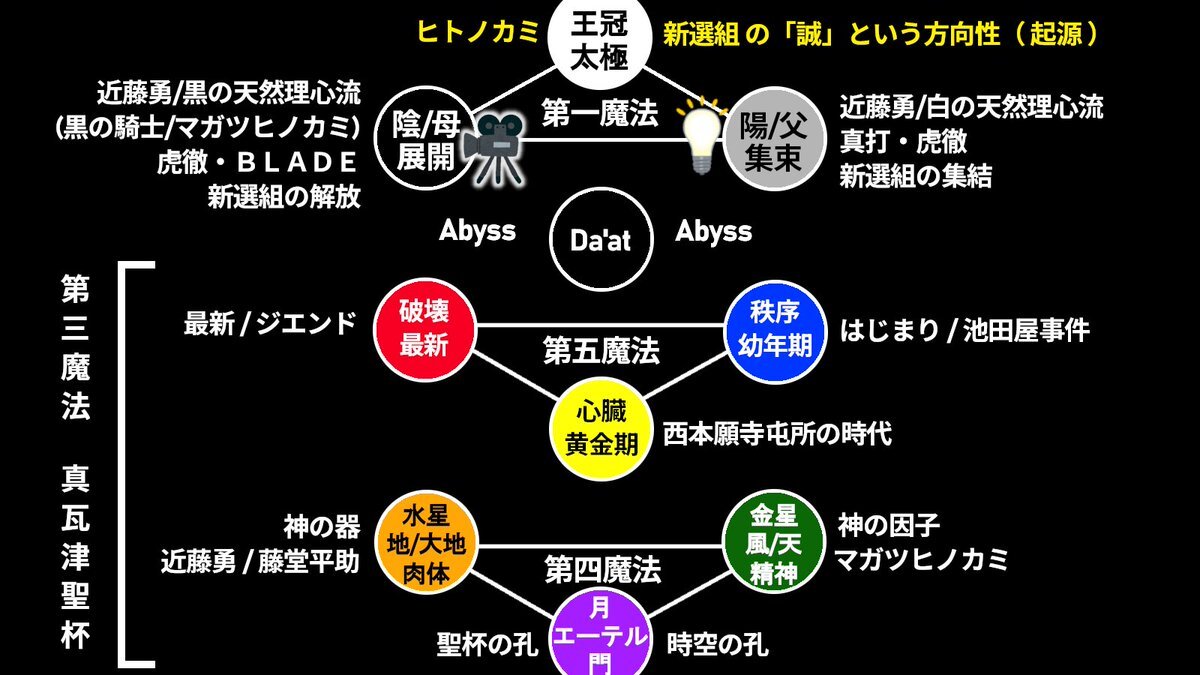 返信先:@YouTube「第三魔法 ≒ 第四魔法+第五魔法」と考えると、弾正ちゃんによる儀式の書き換えがわかりやすいかもしれない。 本来、聖杯の「筐体(ハード)+ソフト→演算装置」だった部分(第四)を、「神の器+神の因子→ヒトノカミ」へと書き換え、参照する世界の記憶(第五/時の運河)を新選組の歴史に限定。 pic.x.com/On4VotUYIe