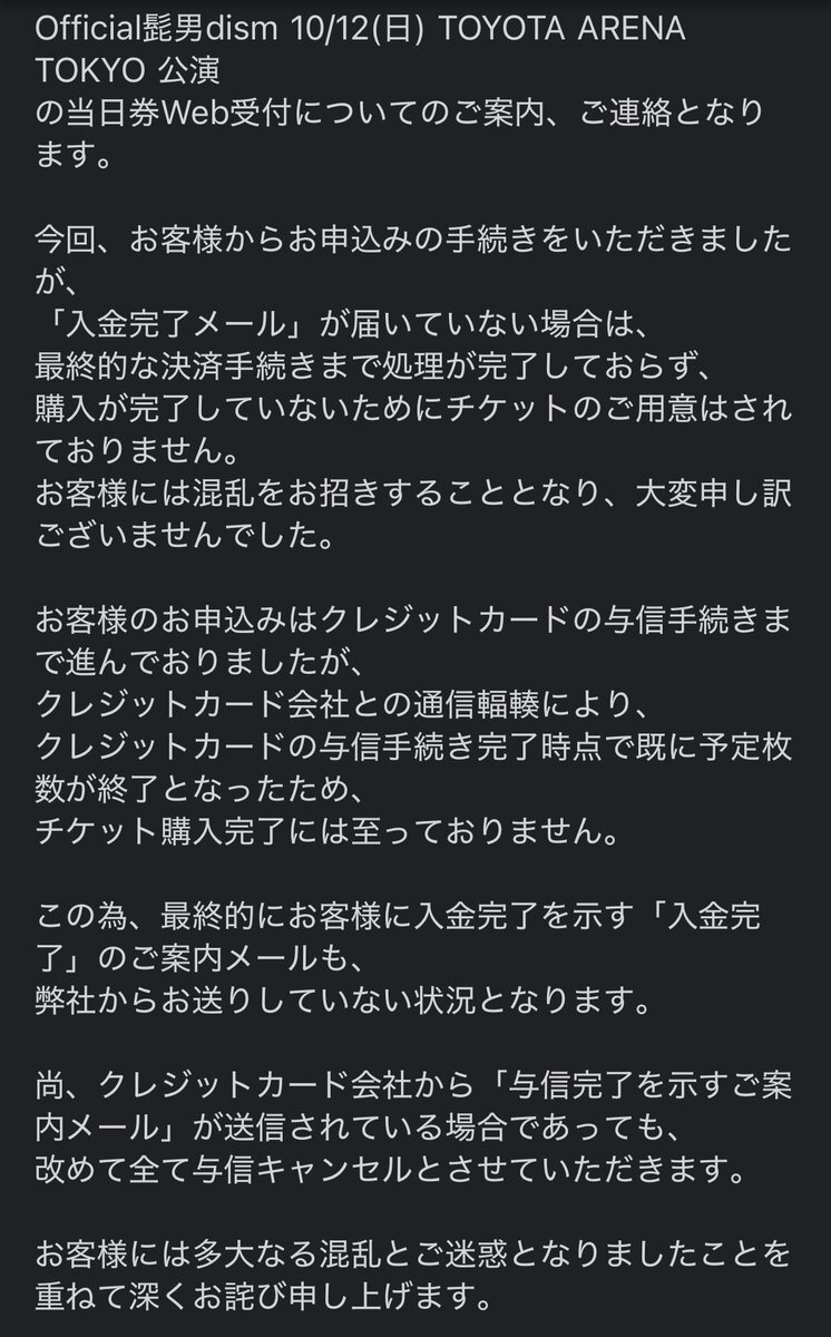 10/0(金)12時からの髭男の機材開放席先着販売で入金完了メールが来なかった方はチケットが確保されていないとのこと。 (ディスクガレージに問い合わせ済) 当日チケットありませんでしたって言われるよりかはマシだからちゃんと連絡きて良かった。 残念…またどこかで行けますように。