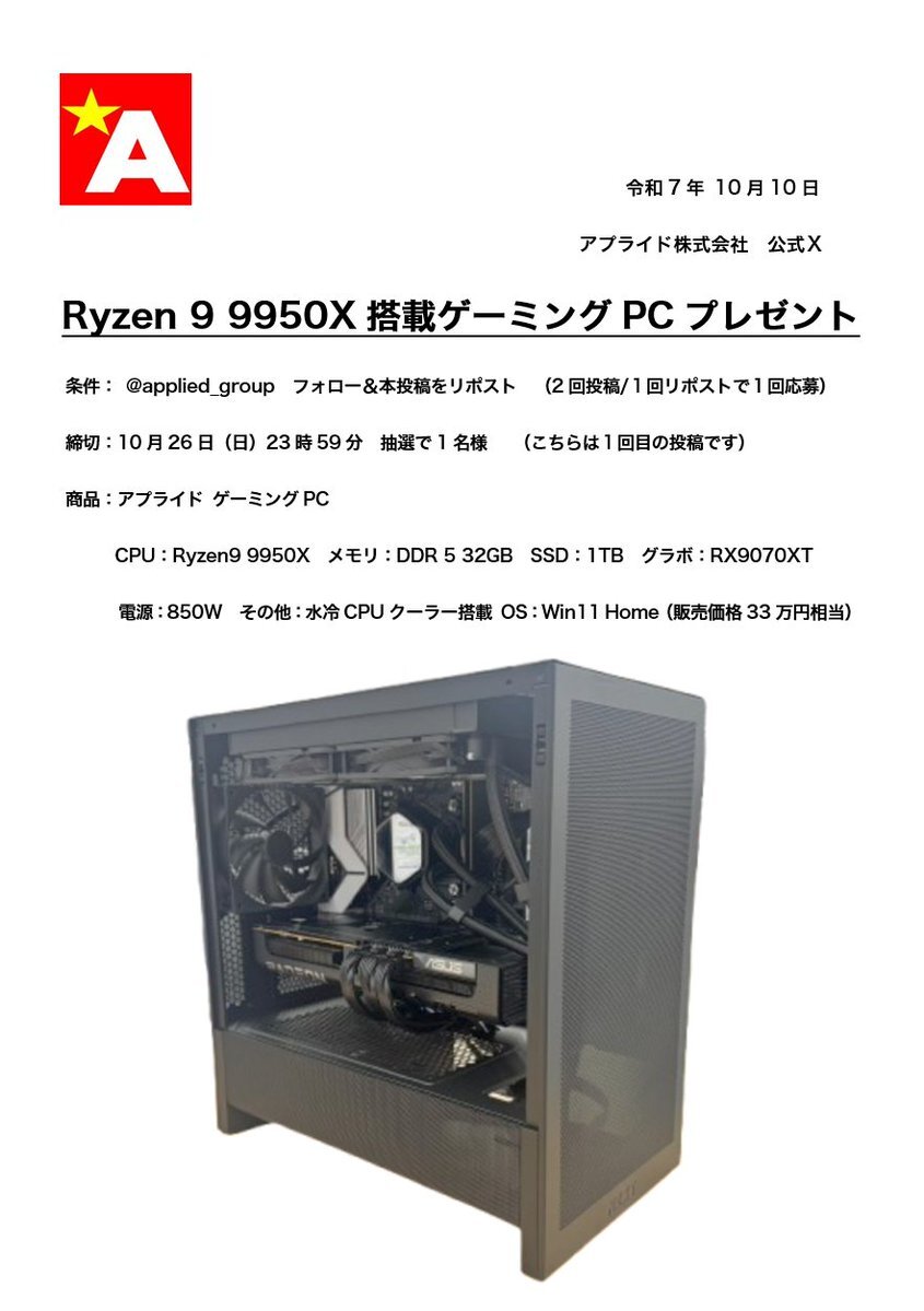 / アプライドゲーミングPCが当たる Ryzen9 9950X RX9070XT搭載モデル プレゼントキャンペーン実施中 \ 1)@applied_group フォロー 2)この投稿をリポスト 3)#ほんとにあったゲームでの怖い話 をつけて引用リポストで当選確率UP