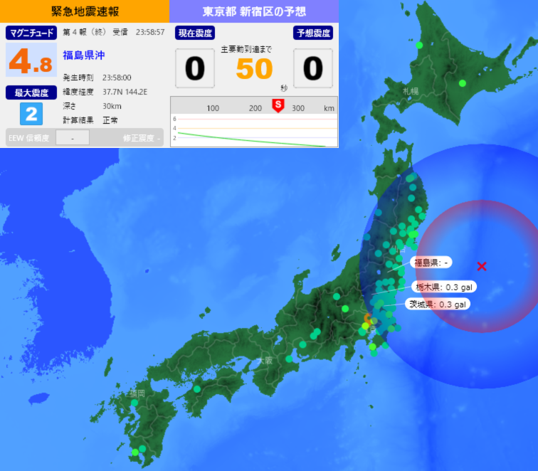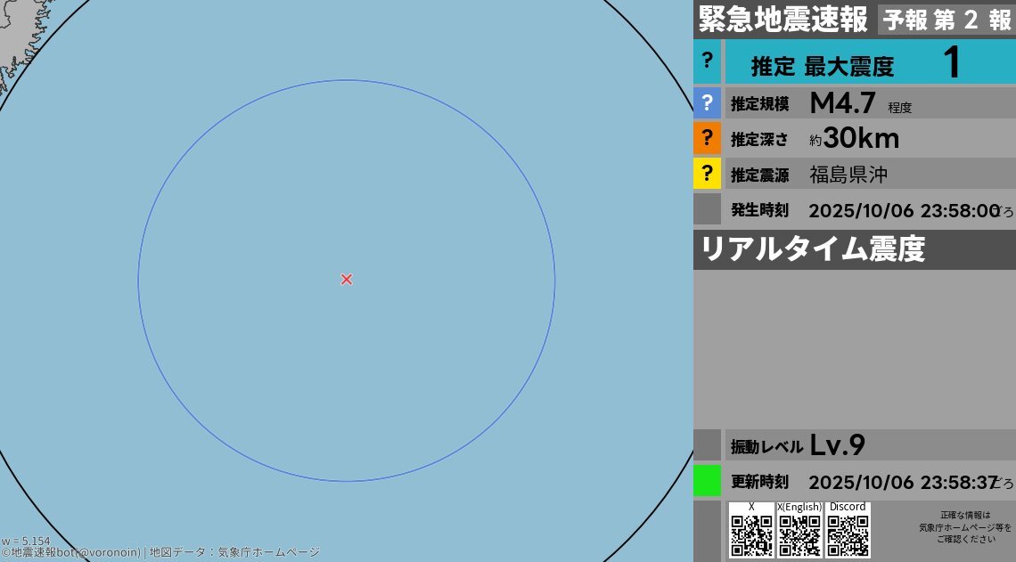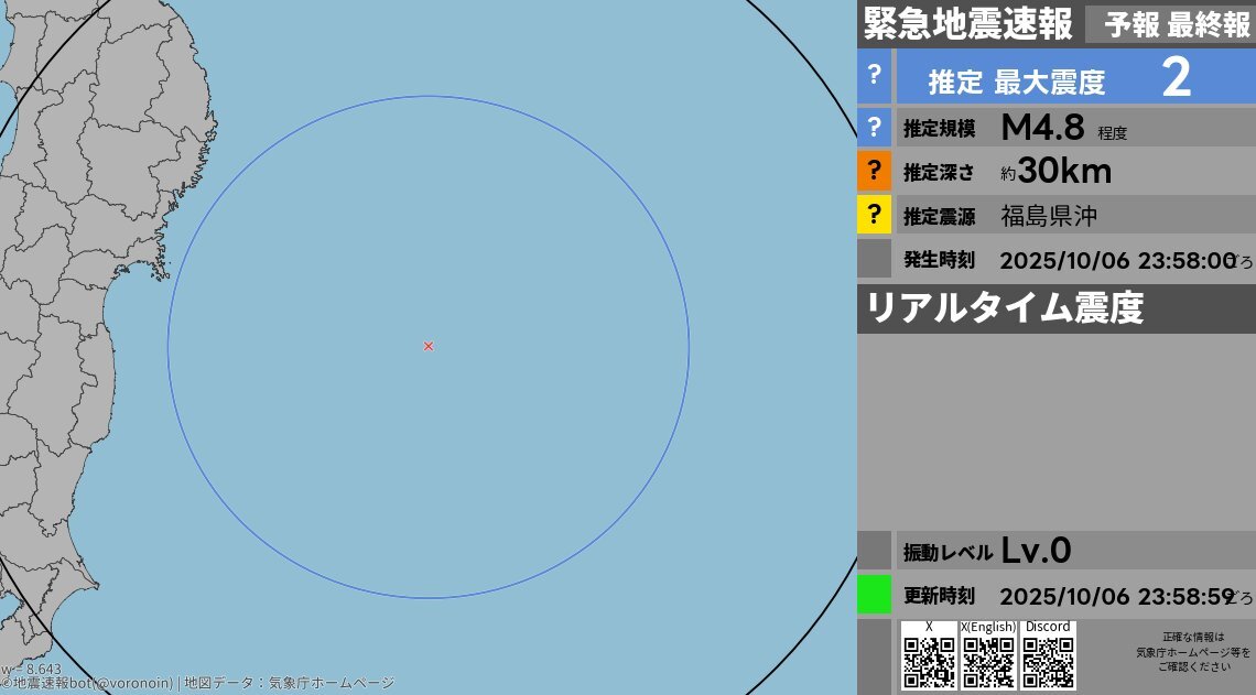 ■■緊急地震速報(最終報)■■ 福島県沖で地震 最大震度 2(推定) [詳細] 2025/10/06 23:58:00発生 M4.8 深さ30km #earthquake #緊急地震速報