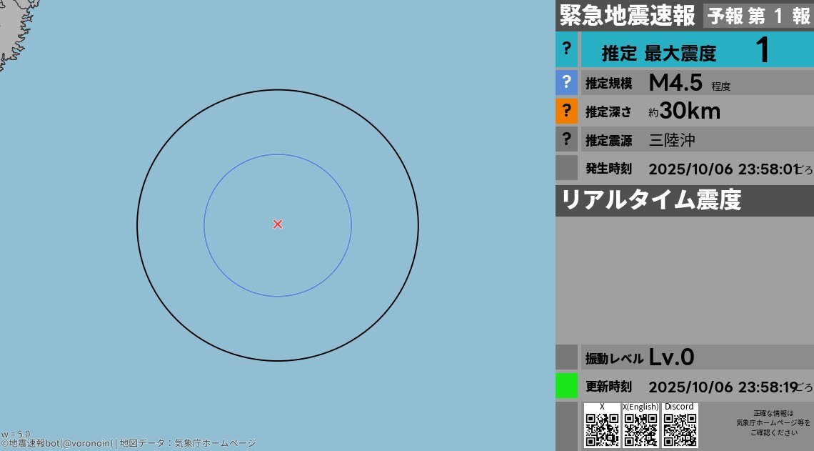 ■■緊急地震速報(第1報)■■ 三陸沖で地震 最大震度 1(推定) [詳細] 2025/10/06 23:58:01発生 M4.5 深さ30km #earthquake #緊急地震速報