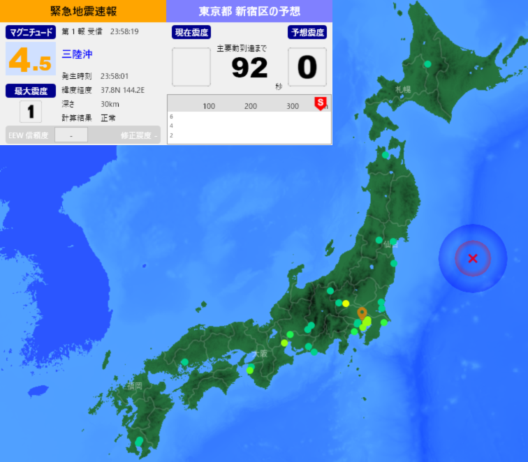 [緊急地震速報] 23:58:22現在 第1報 予報 発生時刻:23:58:01 震央情報:三陸沖 震源情報:37.8N 144.2E 30km 地震規模:M4.5 最大震度:1 予想震度:0.0 猶予時間:あと90秒 pic.x.com/rrhexoNdjs