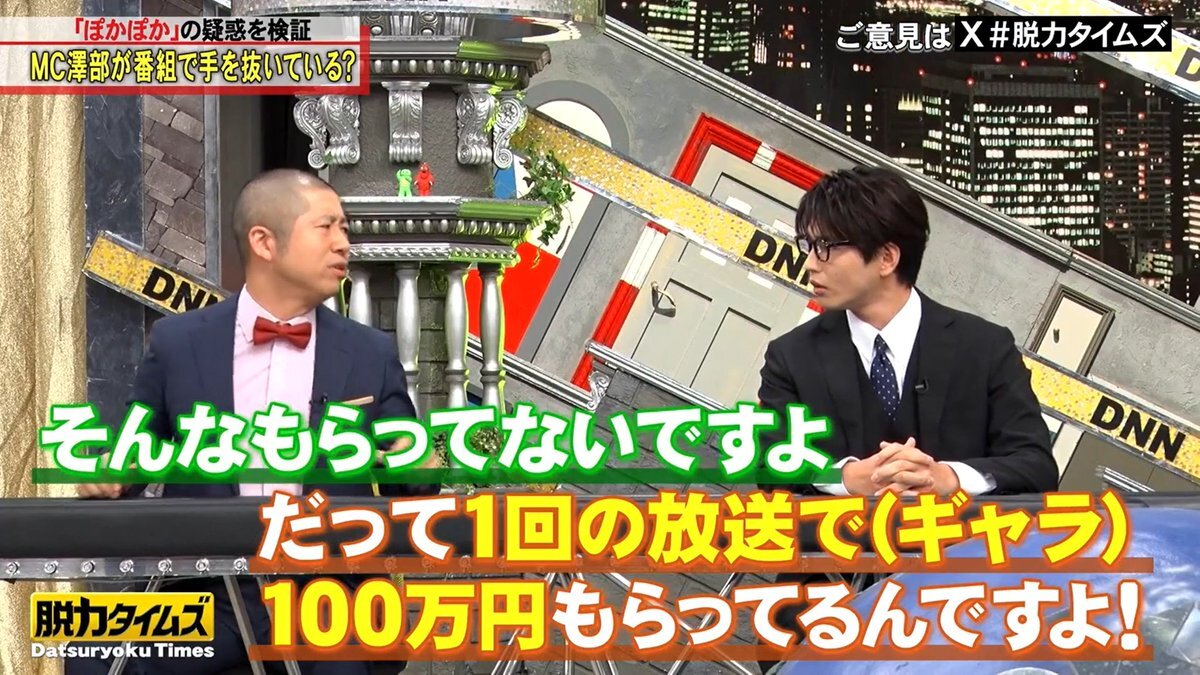『全力!脱力タイムズ』、「ハライチ澤部&中沢元紀、昼は全員流してるから~!?の巻」。 ぽかぽかお邪魔させていただきました。感謝。引っかかったこと。追及。MC澤部が手を抜いてるのではないか。 一生懸命やっていないのではないか。1回の放送で100万円もらってる?。