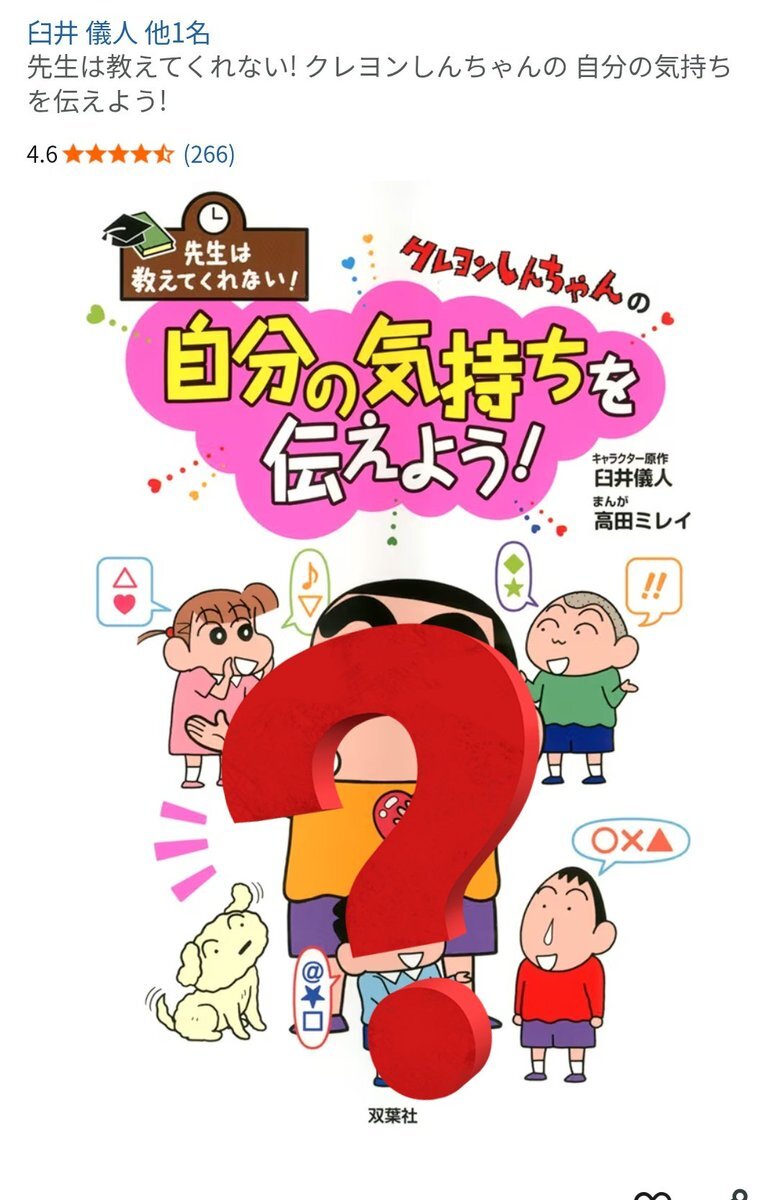 返信先:@bit_ravelこのシリーズ本のどれですか?たぶんこれだと思うのですが、同デザインのが複数あるから、元のページがどの本からのものかをリプで明記していただけると助かります。 『先生は教えてくれない! クレヨンしんちゃんの自分の気持ちを伝えよう!』(臼井儀人:著、高田ミレイ:イラスト/双葉社) pic.x.com/AhByGsjsdy