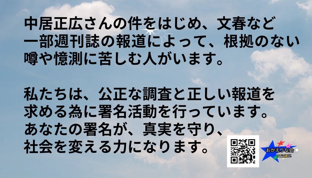 遅くなってしまったけど、#舞祭組結成12周年 おめでとうございます🎊 スルメ🦑さん…舞祭組の4人はとーっても頑張ってますよ😊 中居くんのお陰で舞祭組が結成されてほんとによかった✨ ✍️→chng.it/GRcXSssp8Q 不透明な報道の在り方には疑問です。署名&拡散お願いします🙇 #中居くんの名誉回復 pic.x.com/PNTavwXA8H