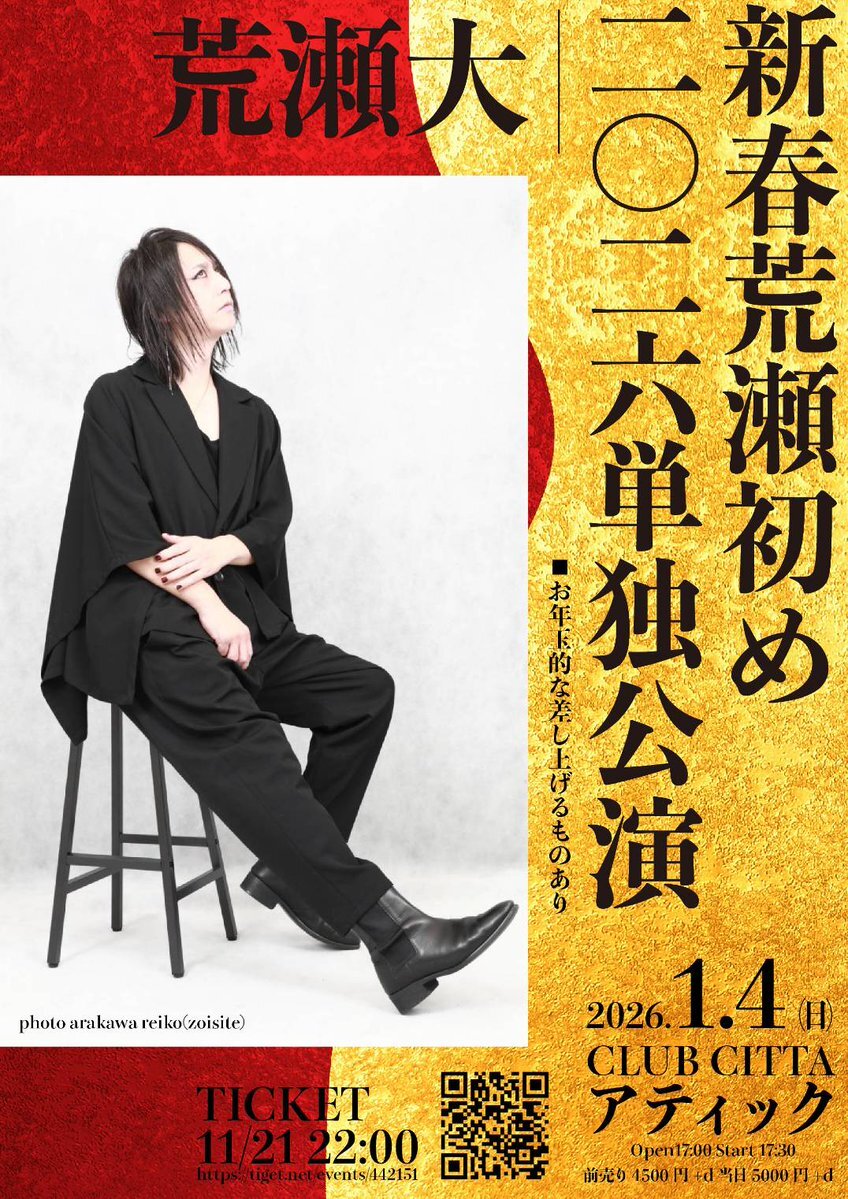 【本日11/21 22:00よりチケット予約開始】 -新春荒瀬初め2026単独公演- 2026.1.4(日)CLUB CITTA アティック 荒瀬大単独公演 ■お年玉的な差し上げるものあり 前売り4500円+d 当日5000円+d Open17:00 Start 17 :30 11/21 22: 00 tiget.net/events/442151 pic.x.com/HDjVoWWa9M