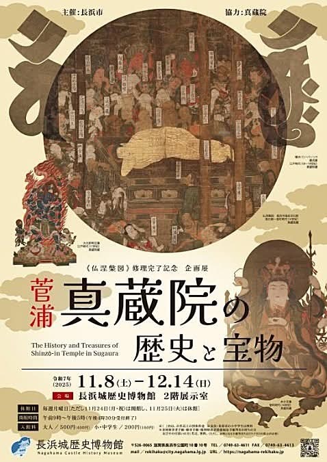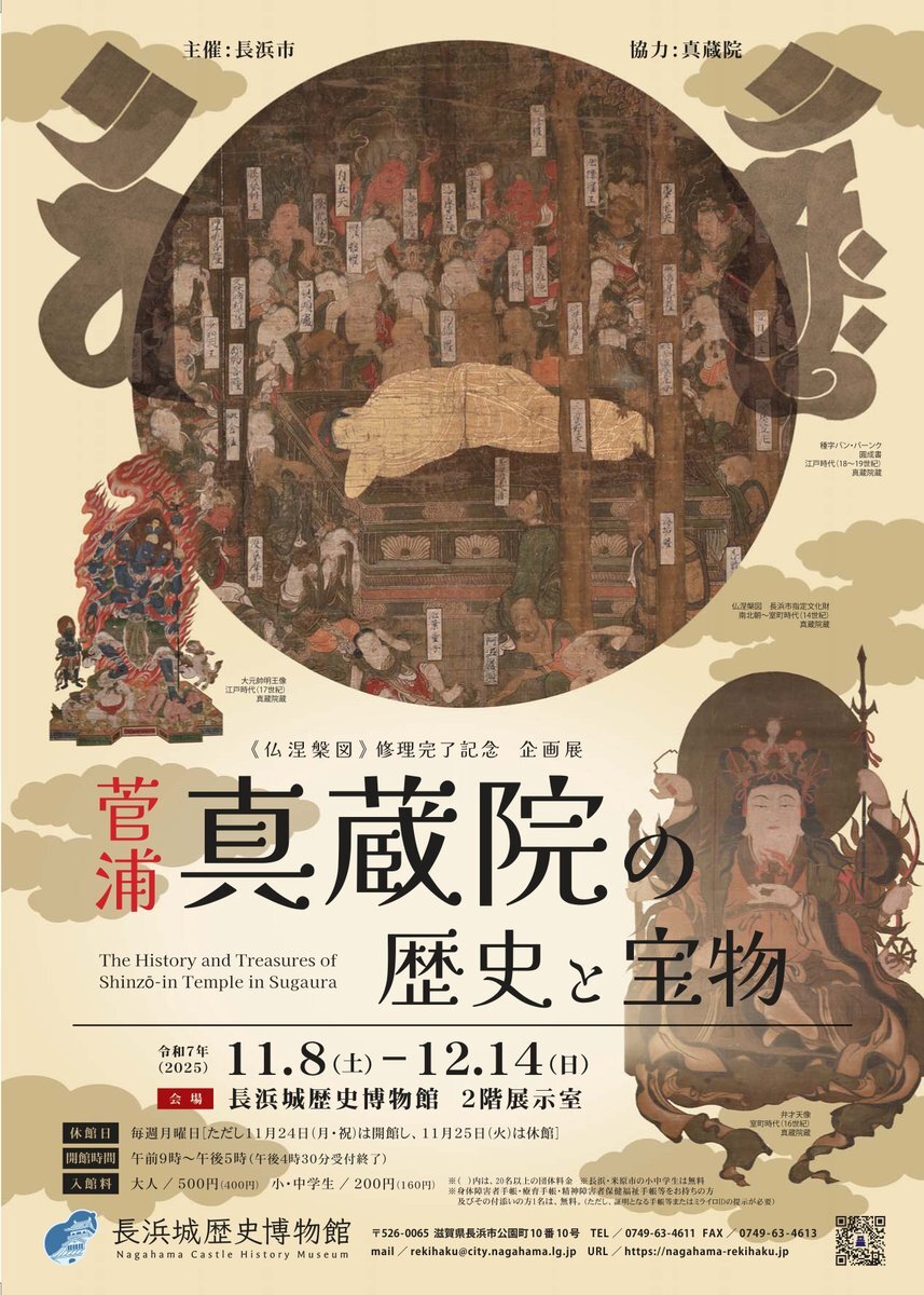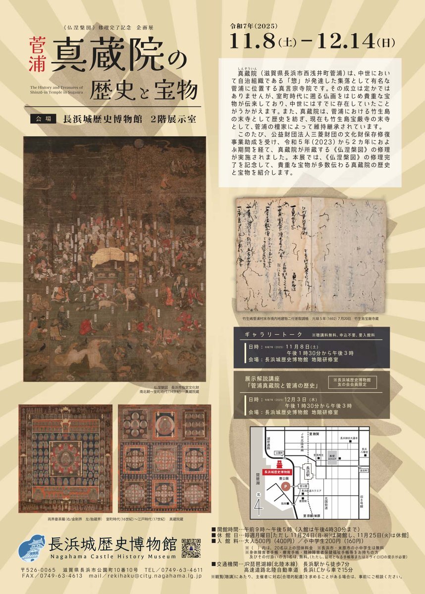 菅浦・真蔵院の歴史と宝物」「南北朝~室町時代の14世紀に描かれた仏画で、修復後の一般公開は初めて。12月14日まで」nagahama-rekihaku.jp/exhibit/580 x.com/nagahama_castl… / “14世紀に描かれた「仏涅槃図」修復完了 長浜城歴史博物館で8日から公開:中日新聞Web” htn.to/3L9jspJg9x