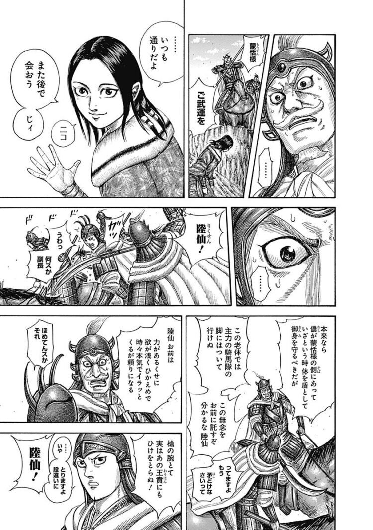 蒙恬…顔がキリリと✨爺にとってはいつまでも若様なのですよって泣きそうになったわ。早く続きが見たいです。楊端和もカッコ良し。私もねぇさんについて行きます。 #キングダム