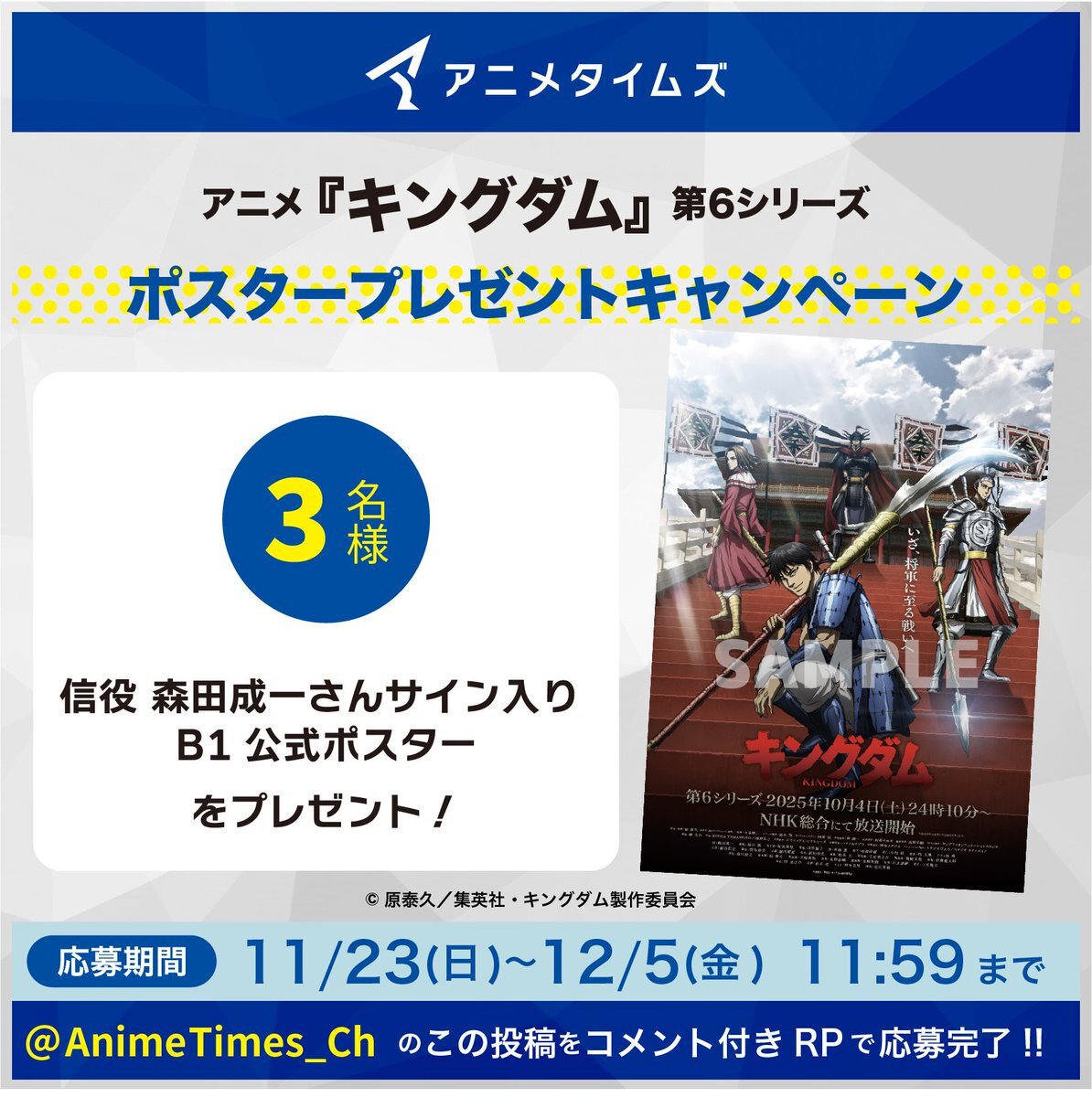 / 「#キングダム第6シリーズ」 ポスタープレゼントキャンペーン📣 \ 抽選で豪華プレゼントが当たる🎁✨ 信役 森田成一さんサイン入り B1 公式ポスター➡️3名様 ✧応募方法 ❶本投稿をコメント付きリポスト 〆切 12/5(金) AM11:59 当選通知 DM✅