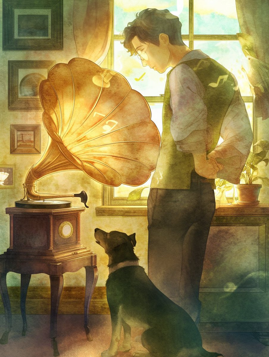 音楽てお題でVect〇rの蓄音機に小首を傾げてるいっぬのロゴ思い出したんだけどその話したら誰もわからんだろと言われた⋯もう10年以上前になくなっちゃったもんね⋯とりあえずアトさんにそのいっぬしてもらった☺️ 親がレコードとか自分でプレイヤー自作してスピーカーも