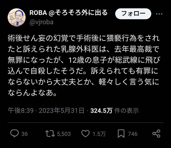 返信先:@yasuda_prof他1人現段階ではおっしゃるとおりですね! ただ、ご存知だとは思いますが日本では三審制が敷かれておりまして、今回の地裁判決をもって法的に決着がついたとは断言できないんですね。 記憶に新しいところでは、滋賀県での乳腺外科医が術後せん妄による女性の証言で訴えられた裁判も、