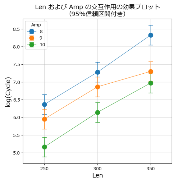 書籍「データ解析のための線形回帰 原著第4版」を徐行運転中! 第8章8.6節の問題を完了しました! 図は問題8.6の効果プロットです。 縦軸は対数変換した目的変数、横軸Lenと複合グラフAmpは要素ごとに。 対数変換で「直線的」関係になるのが気持ちいいです! (コードは省略) by #のんびり統計 pic.x.com/a4ajdu3QqF