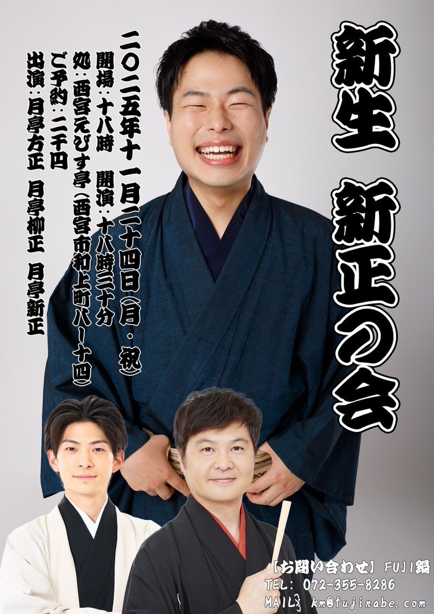 『 新生 新正の会 』11/24(月祝)18時半開演 西宮えびす亭(阪神西宮駅えびす口北すぐ) 月亭新正 月亭柳正 月亭方正 ご予約 2000円 ⭐︎お問い合わせ⭐︎フジ鍋 inc. ☎︎ 072-355-8286 ✉︎ km@fujinabe.com お名前 ご連絡先 人数を pic.x.com/ihfyj9RHtZ