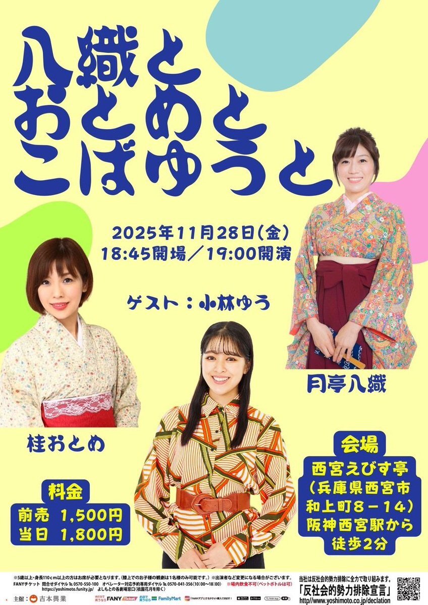 『 八織とおとめとこばゆうと 』11月28日(金)19時開演 西宮えびす亭(阪神西宮駅えびす口北すぐ) 月亭八織 桂おとめ ゲスト吉本新喜劇 小林ゆう ご予約 1500円 当日 1800円 フジ鍋 inc. ☎︎ 072-355-8286 ✉︎ km@fujinabe.com お名前 ご連絡先 人数を pic.x.com/6SYKWEig6e