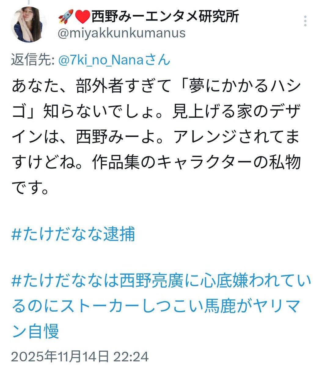 いちども 謝罪もなく メールもなく 書面もなく 3年間、ずっと 西野亮廣の妻に対して あの罵詈雑言をしていただけの ただの馬鹿。 性犯罪者であり 社会的凶悪犯。 全国のお客さんに 嘘八百を撒き散らし 西野亮廣の妻イビリ。 #西野亮廣は妻側 x.com/miyakkunkumanu…