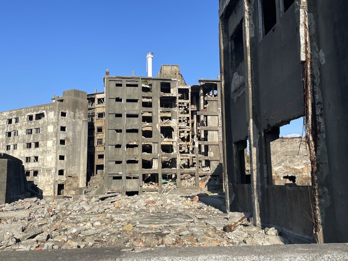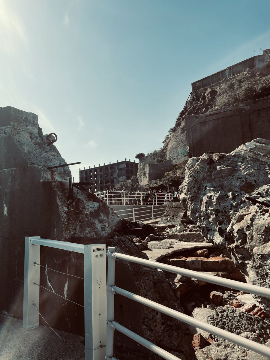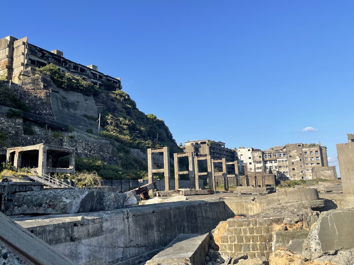 上陸後すぐに目の当たりにする護岸が倒れた場所。十数年前の台風でこの壁が倒れて中の様子が見えるようになりました。第一見学所のほうも確認出来ます。 #軍艦島 #端島 #長崎 #世界遺産 #軍艦島デジタルミュージアム #軍艦島コンシェルジュ pic.x.com/ij23oXX6Fv