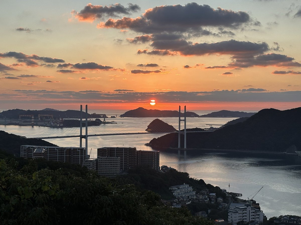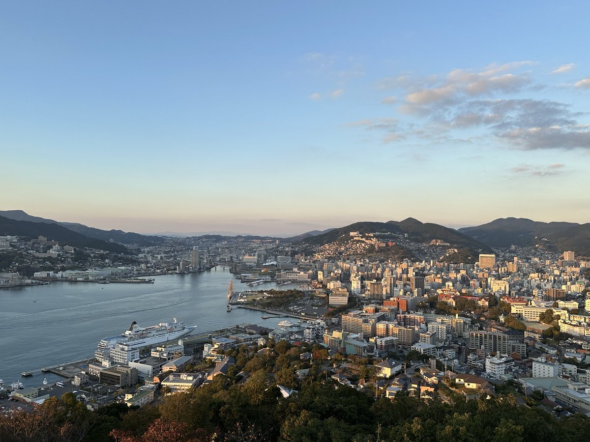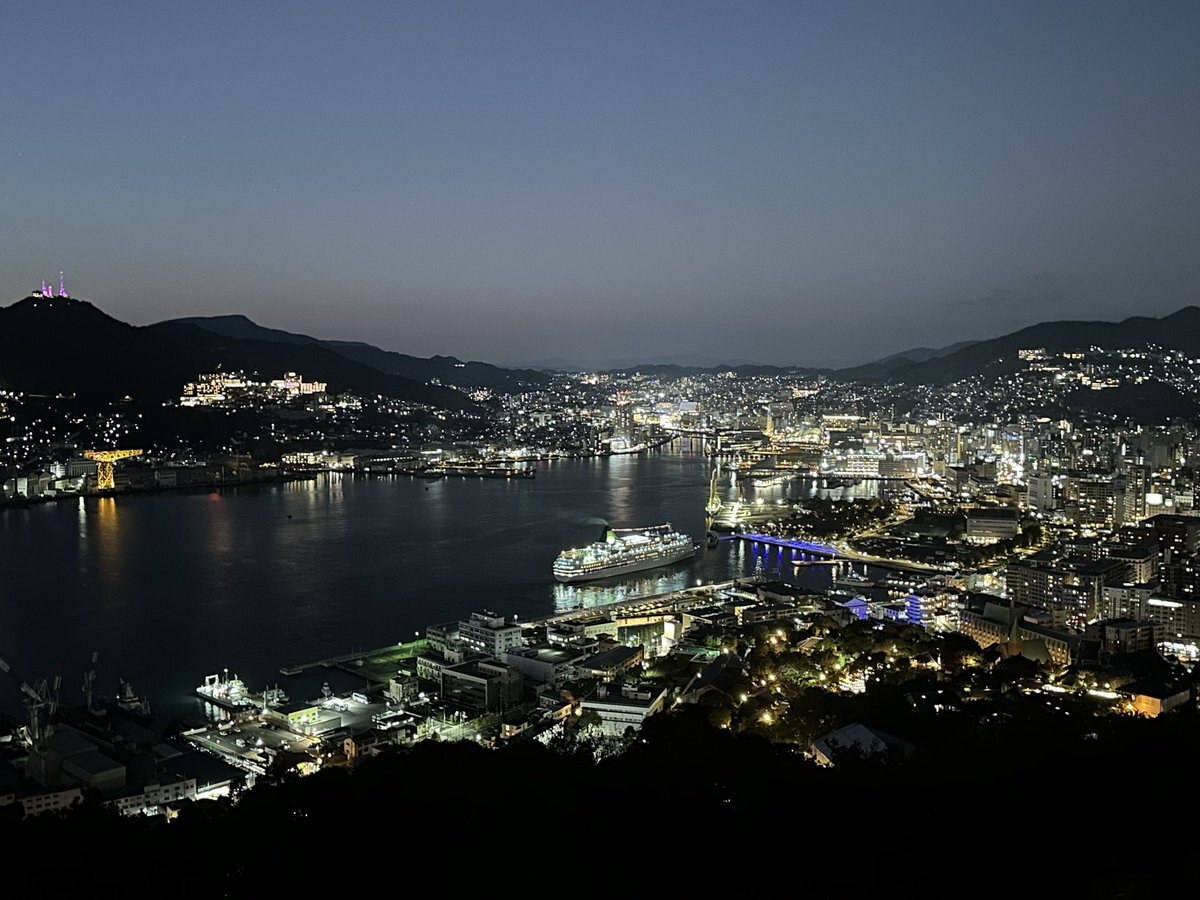 長崎ではまず鍋冠山の展望台へ行きました。ここからですと長崎の街が一望できます。夕日の向こうに軍艦島も見える…かな。 夜景も素晴らしく綺麗でした。 ただ交通手段が車しかないので行きはタクシー使いましたが帰りは歩いて下山となりました。 pic.x.com/YPVRBCkHCW
