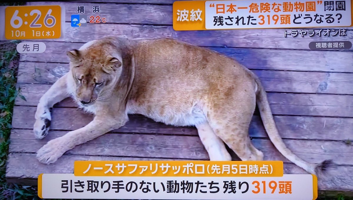 ノースサファリサッポロって、THE TIME,の中継やめざましテレビの三宅アナファイナルで同期の軽部アナと一緒に巡る企画で出てきたけど、違法建造物問題で昨日閉園。引き取り手の無い動物の行方はどこへ…。 #グッドモーニング pic.x.com/zwdZ3zfphR