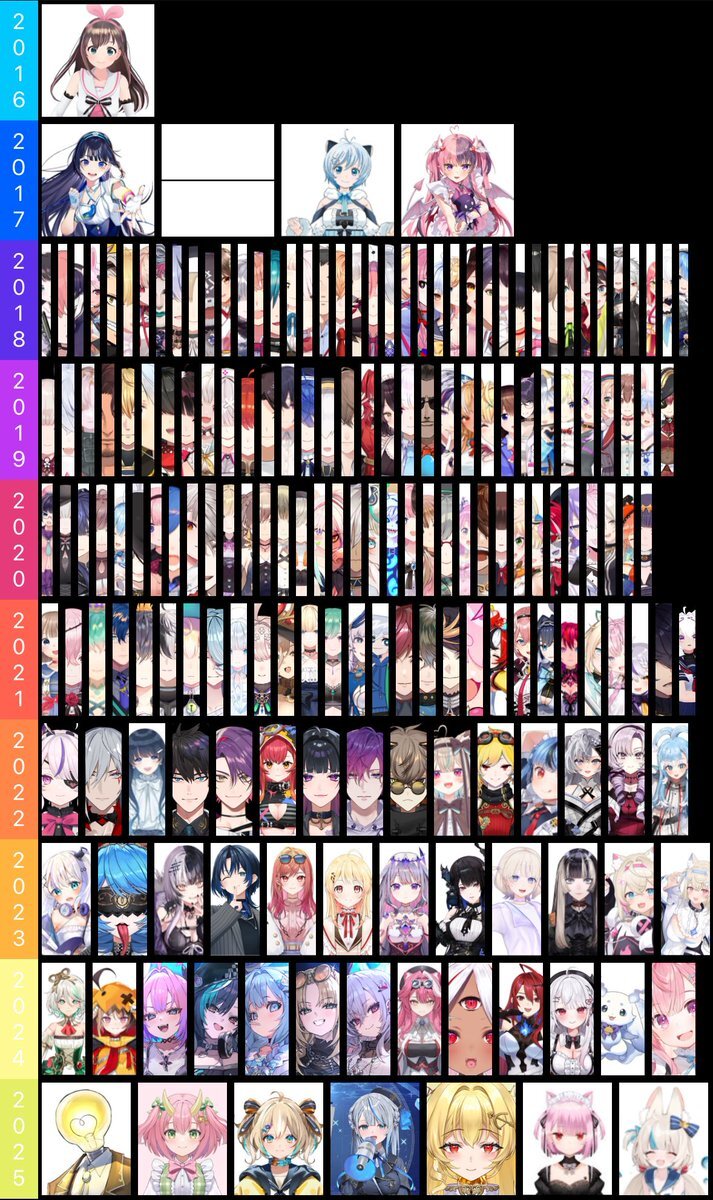 ザッと見ただけでも輝夜月やミライアカリ等初期の有名どころが居ないし、ときのそら等何人かの位置がおかしいし大まかが過ぎるな 何のために作ったのこの表 x.com/Pika3yoro/stat…