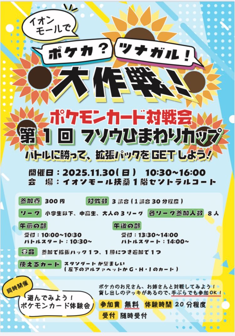 11月の犬山線ポケカイベントのお知らせです。 30日(日)にイオンモール扶桑で第1回フソウひまわりカップを開催。大人から子どもまで参加できて1勝ごとに1パックプレゼント。 連休明けの25日(火)は平日うすしお会を予定しています。みなさんお気軽にお越しください🙇 pic.x.com/5pEKm6jW19
