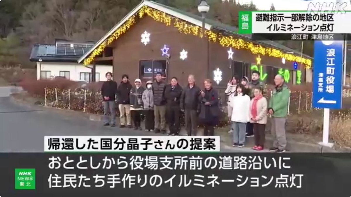 一昨年避難指示が一部で解除され今は帰還した人と移住した人の計19人が暮らしている福島県浪江町津島地区で6日、住民手作りのイルミネーションの点灯が始まった。賑わいが少ない地域を活気づけようと帰還した国分晶子さんの提案で住民たちが役場支所前の道路沿いで行っている。news.web.nhk/newsweb/na/nb-… pic.x.com/bS27JLeawD