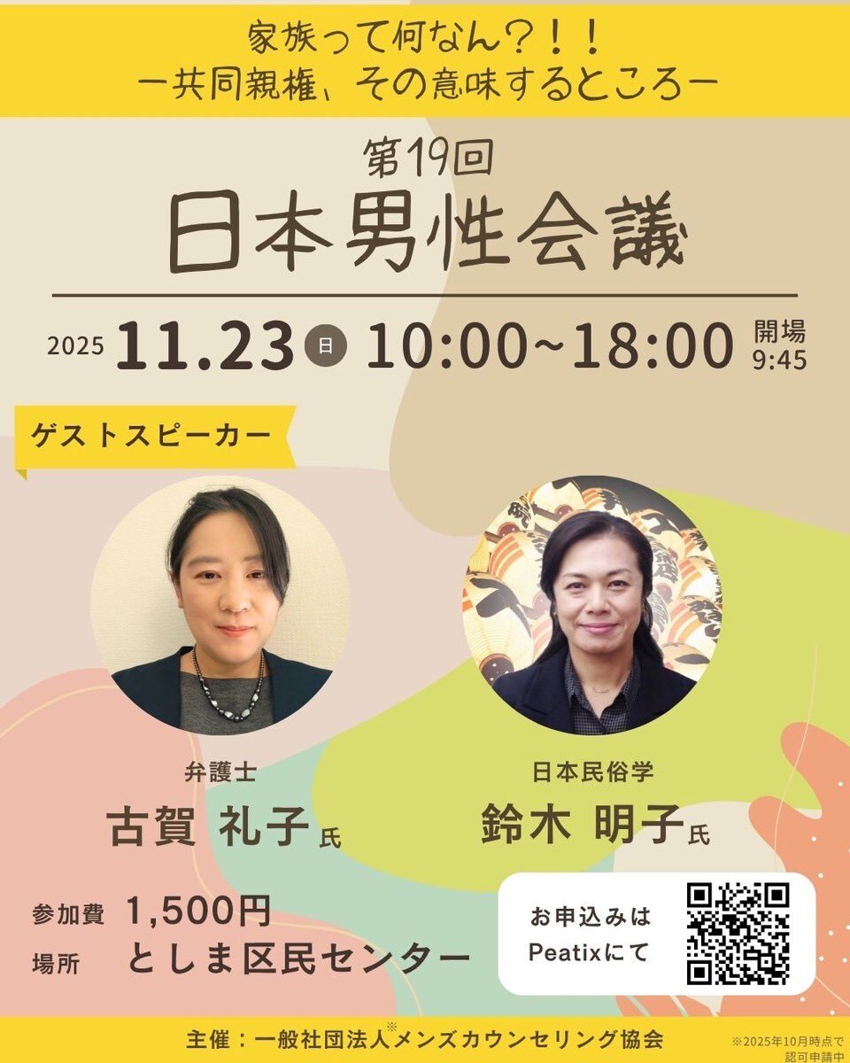 🌏第19回 日本男性会議 家族って何なん?! 共同親権、その意味するところ 来年に導入予定の共同親権。法律だけで問題は解決できるのでしょうか?家族のかたちついて、考えます。 📅 11/23(日) 🎤 ゲスト:古賀礼子氏(弁護士)/鈴木明子氏(日本民俗学) 🔗お申込み:danseikaigi1123.peatix.com