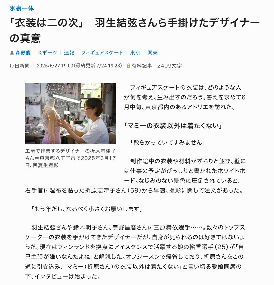 アイスダンス・折原裕香さんのママ(折原志津子)さんは、衣装デザイナーなのだった。「羽生結弦さんや鈴木明子さん、宇野昌磨さんに三原舞依選手……」と、記事はある。氷上でこんなダンスもあるかとびっくり、楽しいアイデアにあふれた演技だった。 pic.x.com/hkwc9XY4AU