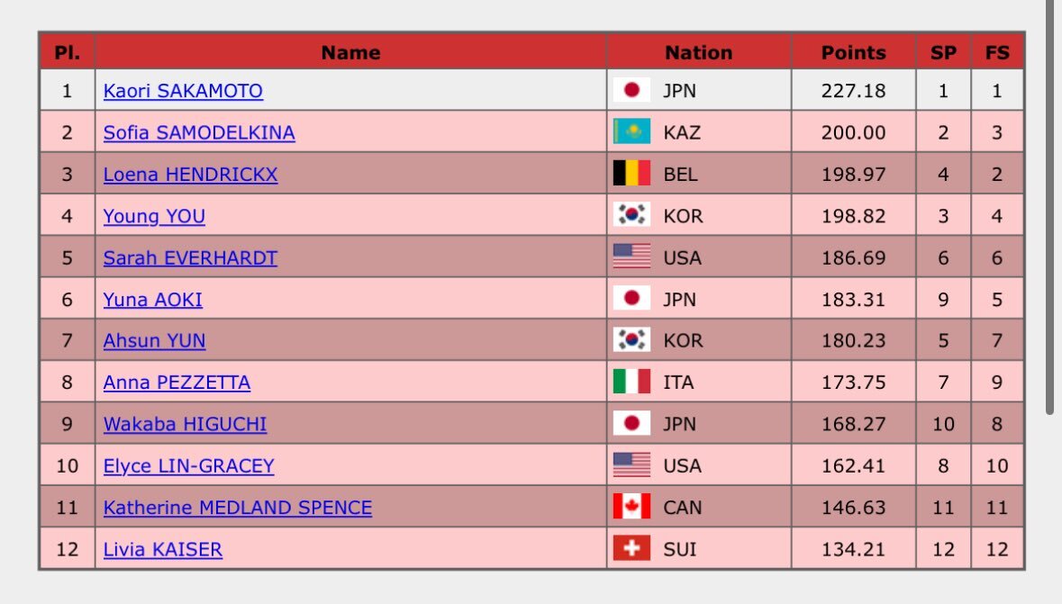 【GPS NHK杯 女子結果】 🥇坂本花織🇯🇵227.18 🥈S.サモデルキナ🇰🇿200.00 🥉L.ヘンドリクス🇧🇪198.97 ④ユ・ヨン🇰🇷198.82 ⑤S.エバーハルト🇺🇸186.69 ⑥青木祐奈🇯🇵183.31 ⑦ユン・アソン🇰🇷180.23 ⑧A.ペゼッタ🇮🇹173.75 ⑨樋口新葉🇯🇵168.27 ⑩E.リン=グレイシー🇺🇸162.41 isuresults.com/results/season…